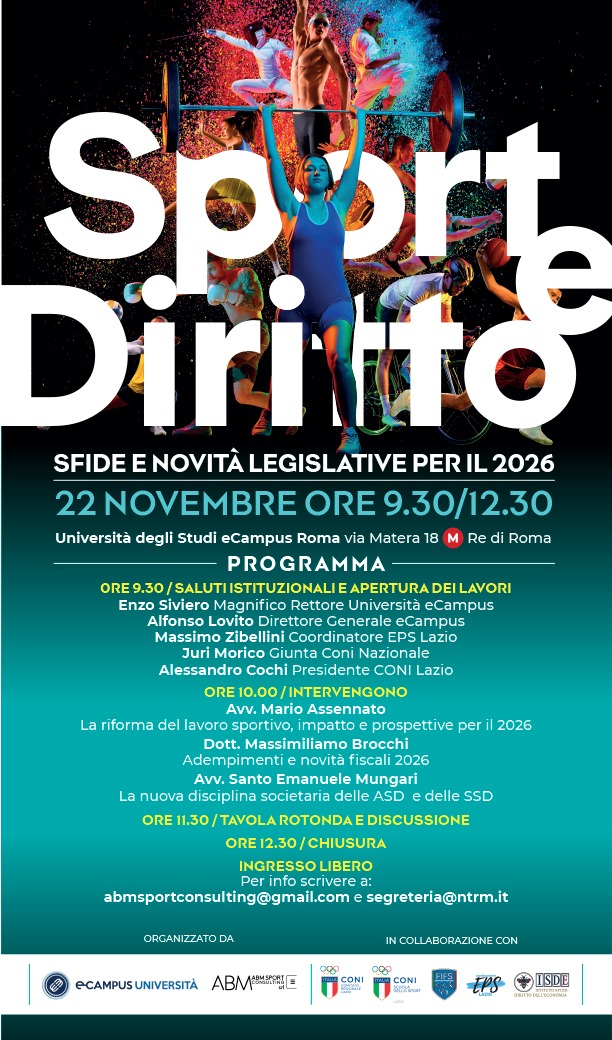 Si svolgerà il 22 novembre, presso l’Università eCampus di Roma (via Matera, 18), il convegno “Sport e Diritto – Sfide e novità legislative per il 2026”, appuntamento organizzato da eCampus Università in collaborazione con EPS Lazio, ISDE, ABM Sport Consulting e con il patrocinio del CONI Lazio e della Scuola Regionale dello Sport .